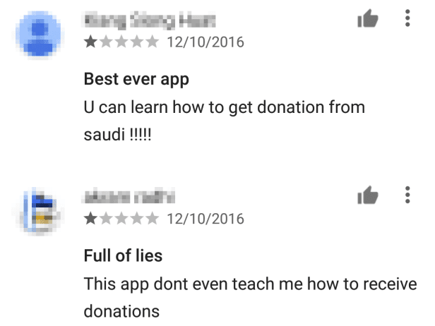 Yang ini pelik sikit. Ada sorang cakap app ni mengajar untuk mendapatkan derma dari Arab Saudi. Sorang lagi pulak cakap app ni tak mengajar macam mana nak dapatkan derma.
